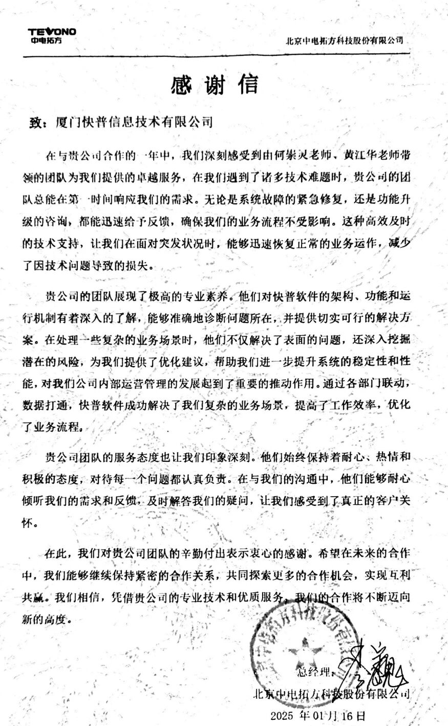 【快普簡訊】 北京中電拓方科技股份有限公司向我司發(fā)來感謝信,對何崇靈老師、黃江華老師帶領的實施小組在過去一年中提供的優(yōu)質(zhì)服務表示高度認可和衷心感謝。來信不僅是對快普實施團隊專業(yè)能力的肯定,更是對快普“客戶至上”服務理念的詮釋。